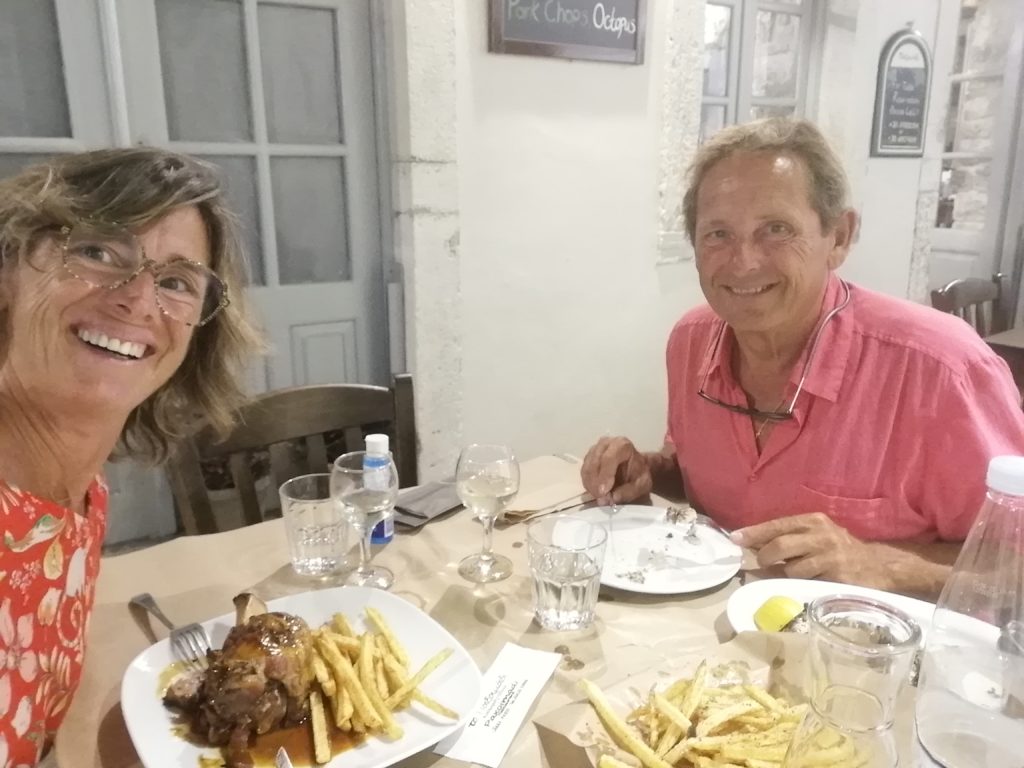El lunes recibimos una llamada telefónica, Pierre Gaffori y Arénie quienes están de vacaciones en la región. Han alquilado un velero y viajan de isla en isla. Quedamos en reunimos con ellos en el puerto de la isla de Kalamos para pasar la noche juntos.