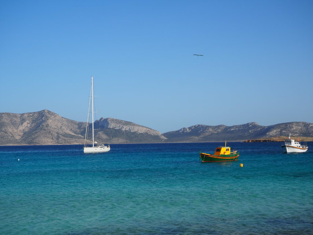 Al llegar, las dos posibles bahías para fondear están totalmente abiertas al viento actual y nos refugiamos en la isla vecina de SHINOUSSA, en la bahía de TSIGOURI BEACH, con una gran playa de arena, junto al puerto de MERSINI. Es una isla de las pequeñas Cícladas poco poblada (unos 100 habitantes) y muy poco turística. Siendo fértil, a diferencia de sus vecinos, allí se cultivan vides para producir vino.